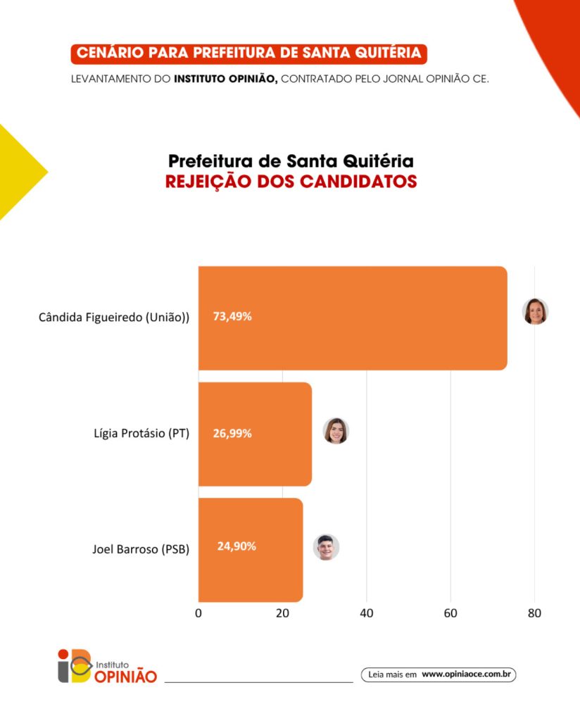 Além do empate nas intenções de voto, o levantamento mostra equilíbrio também nos índices de rejeição. Cândida Figueiredo lidera nesse quesito, com 73,49%. Joel Barroso registra rejeição de 24,90%, e Lígia Protásio tem 26,99%.