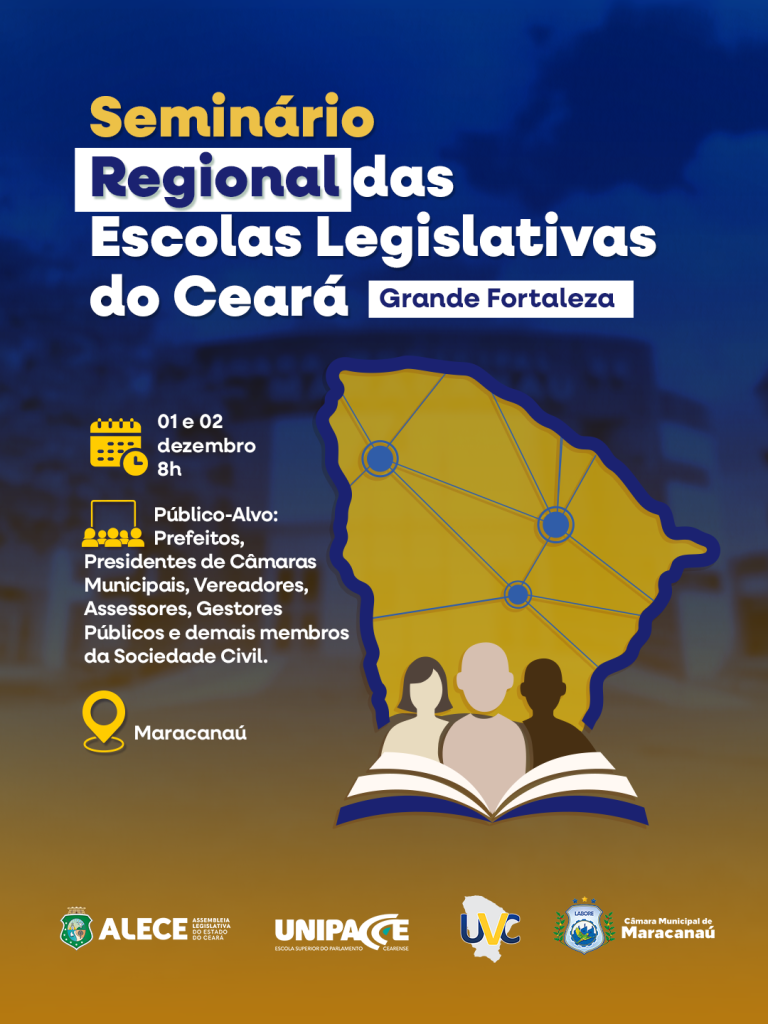 A Escola Superior do Parlamento Cearense (Unipace), em parceria com a Assembleia Legislativa do Estado do Ceará (Alece), promove nos dias 1º e 2 de dezembro de 2025 o Seminário Regional das Escolas Legislativas – Grande Fortaleza, no município de Maracanaú. As inscrições são gratuitas e seguem abertas até o dia 1º de dezembro.