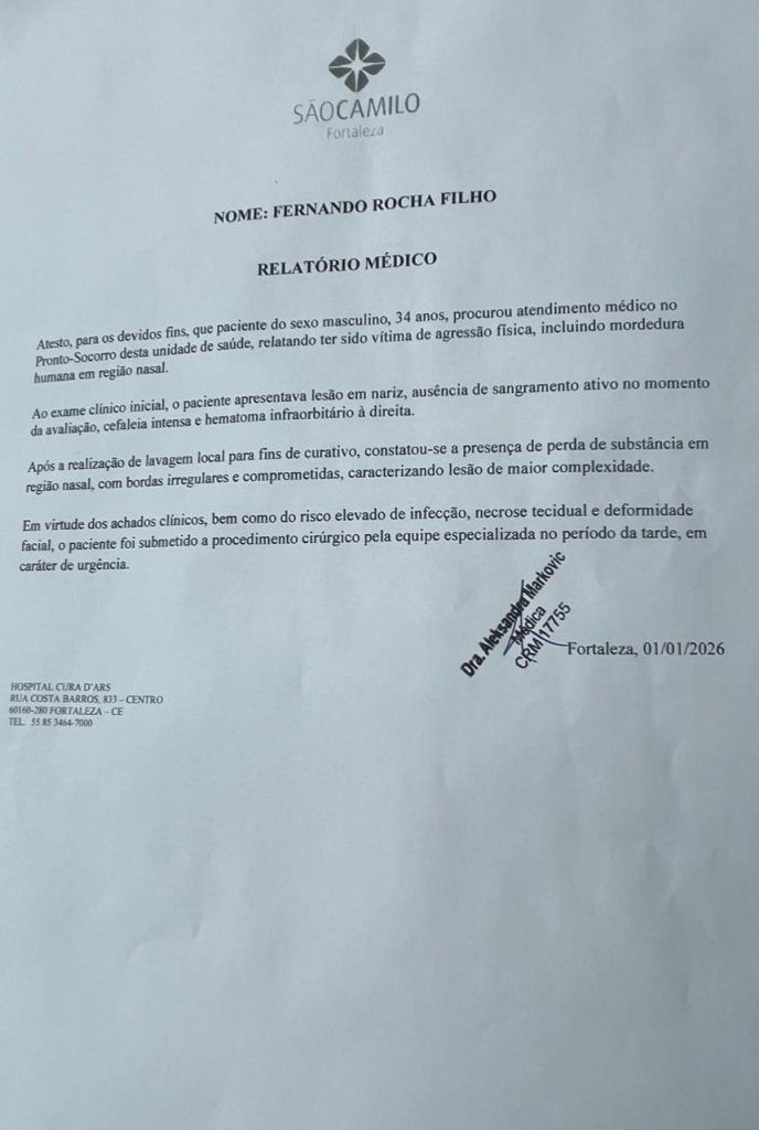 Vídeos e imagens divulgados após a confusão registrada em um condomínio residencial no município de Eusébio mostram o resultado das agressões sofridas por moradores após uma reclamação de som alto. O episódio ocorreu na manhã do dia 1º de janeiro de 2026 e envolve jogadores do Fortaleza Esporte Clube.